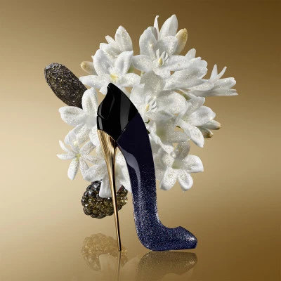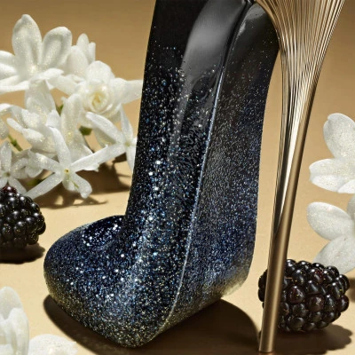 Son flacon iconique en forme de talon stiletto vertigineux dévoile une eau de parfum pour femme enveloppée d’un écrin noir profond mystérieux, moucheté d’or scintillant.